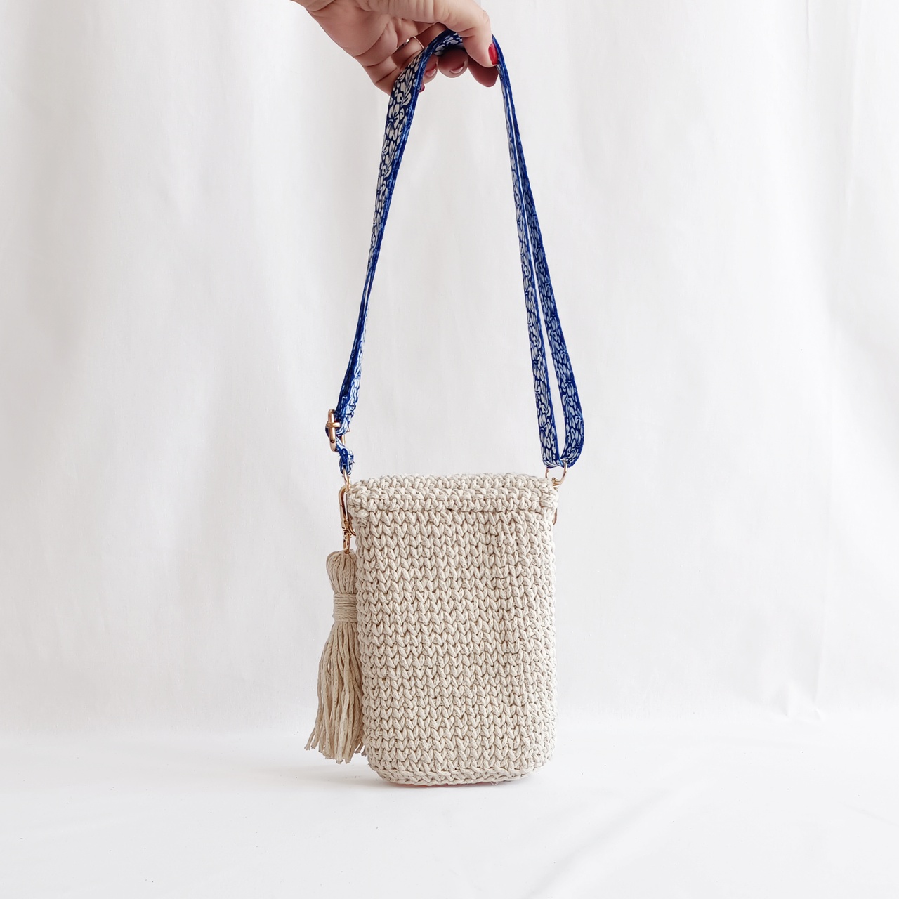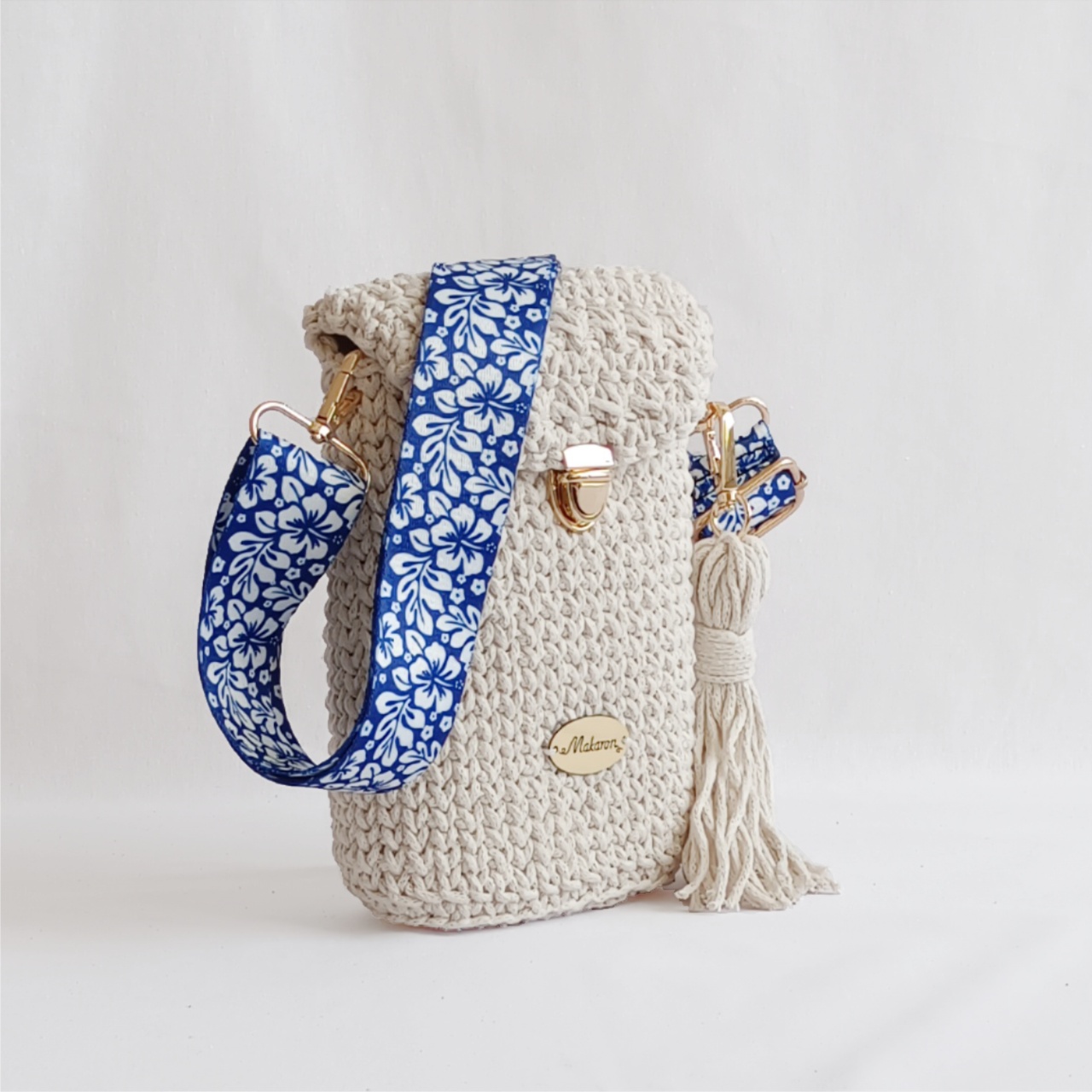 Crossbody Kapsička ve smetanové barvě se střapcem má tvar tobolky. Modro bílý popruh s květy je nastavitelný. Kovové doplňky laděny do zlaté barvy. Uzavíratelná je na jedno zacvaknutí. Výhodou je, že se do ní vejde víc věcí než jen mobil. Vyrobena je ze 100% recyklované bavlny. Péče o ni není náročná, nečistoty lze otřít vlhkým hadříkem, prach vysát.