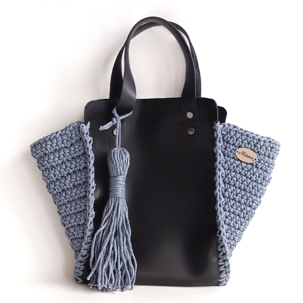 Kabelka je z černé eko kůže s ručně háčkovanými bočnicemi v barvě jeans. Nosit ji můžete ve složené i rozložené variantě, jak se vám zrovna zamane. Zapínání má magnetické. Materiál na bočnice je 100% bavlna. Šetrné ruční praní.