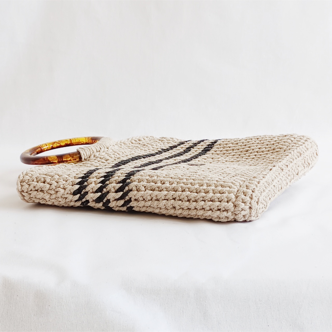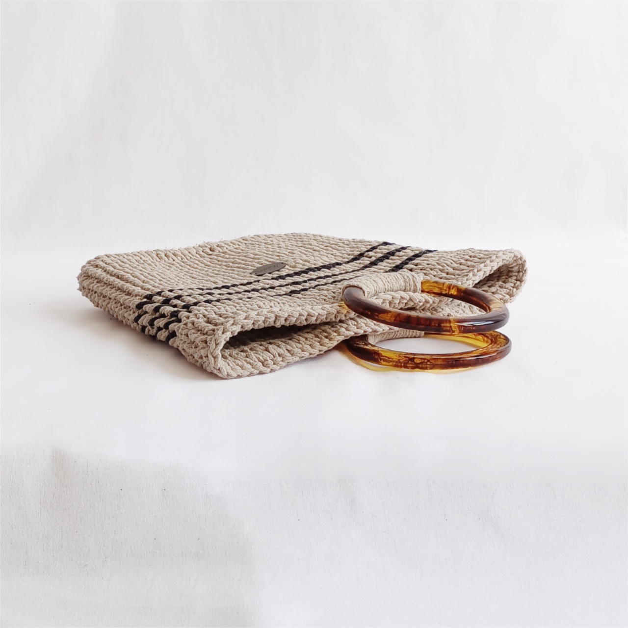 Velmi pevná, letní kabelka Sahara. Oživí váš outfit jak ve městě tak u vody. Rukojeť je v imitaci jantaru. Vyrobena ze 100% recyklované bavlny. Péče o ni není náročná, nečistoty lze otřít vlhkým hadříkem nebo namočením do vodní lázně, sušit ve vodorovné poloze. Prach vyprášit nebo vysát.