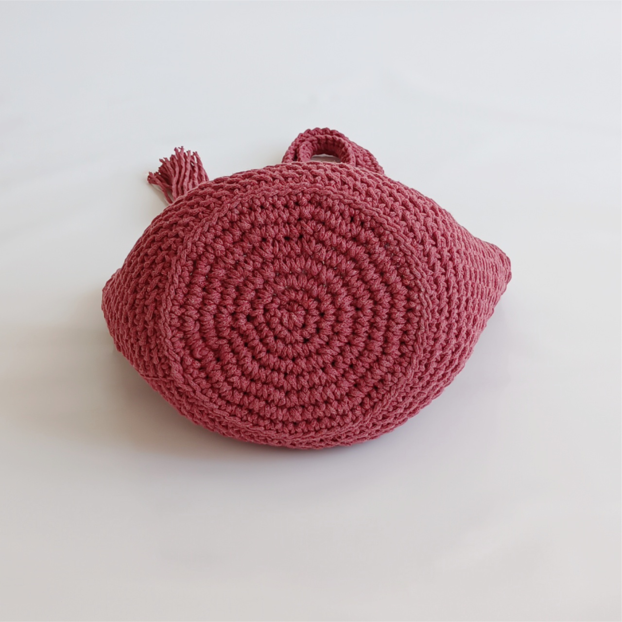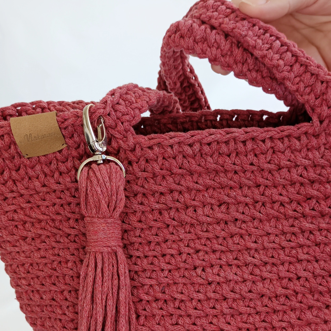 Malinová, velká kabelka. Háčkovaná ucha. Pevné háčkované dno, díky kterému kabelka drží tvar. Odnímatelný ozdobný střapec na karabinu. Vyrobeno z 100% recyklované bavlny. Možnost šetrného ručního praní.