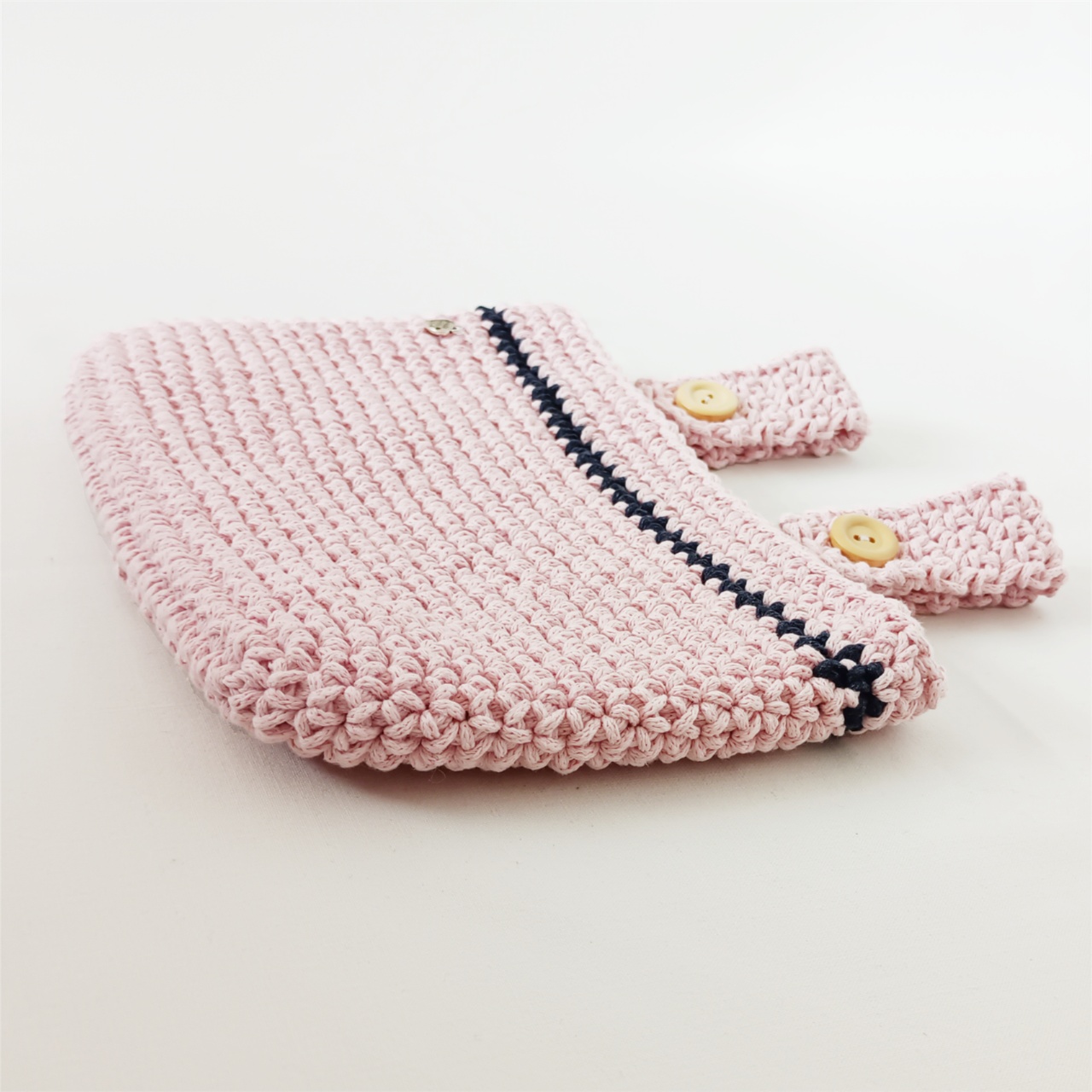 Ručně háčkovaný, střední růžový kapsář s antracitovým proužkem a dvěma knoflíky. Vyroben z recyklované pevné příze 100% bavlny. Perfektně se hodí do koupelen, pokojů, k dětským postýlkám. Možnost šetrného ručního praní max. na 30°C.