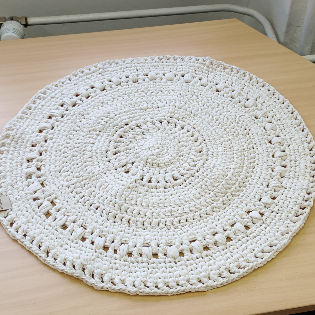 Háčkovaný kobereček o průměru 53 cm. Široká možnost využití v jemné smetanové barvě. Udělá vám parádu a zahřeje nohy před postelí, gaučem nebo v koupelně. Poslouží vám jako dekorace na stole, komodě, pod květináč. Vyroben ze 100% bavlny. Šetrné ruční praní na 30°, sušit volně. Nežehlit.
