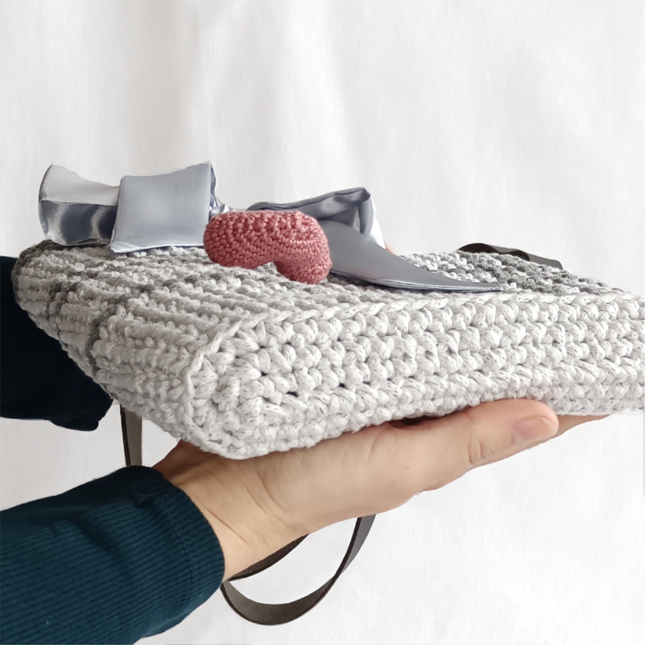 Ručně háčkovaná taška Linie s vodorovnými a svislými linkami. Taška si pohrává s šedými odstíny. Něžnost tašce dodává saténová stuha a háčkované srdíčko. Kožená ucha o délce 80 cm můžete nosit na rameni i v ruce. Vyrobena je ze 100% bavlny.