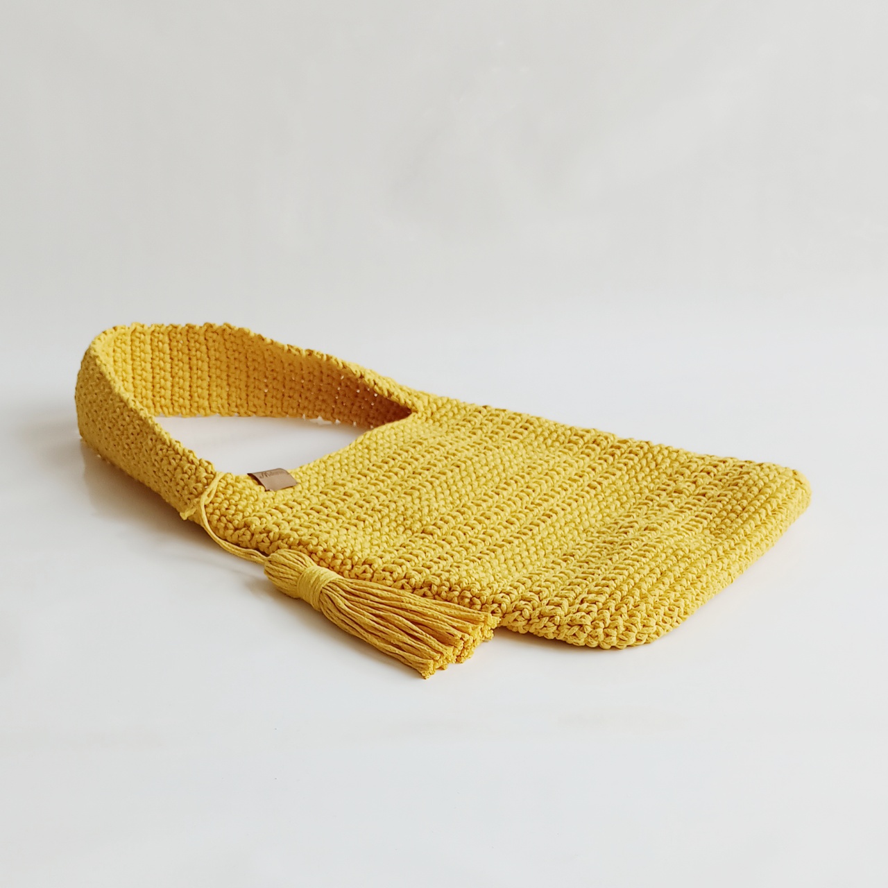 Žlutá taška Pampeliška je velká a má vnitřní kapsičku. Nošení na rameno je příjemné díky širokému uchu. Tašku zdobí dvojitý vzor a střapec. Vyrobena ze 100% recyklované bavlny. Možnost šetrného ručního praní.