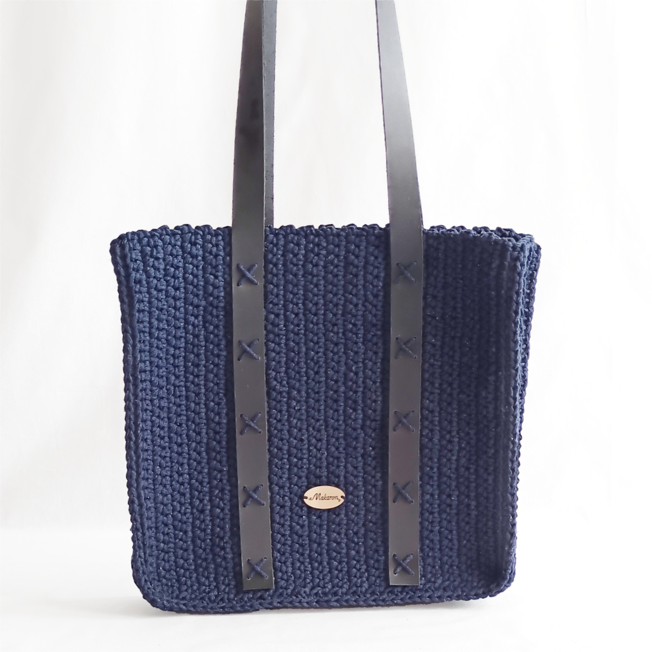 Ručně háčkovaná praktická a prostorná taška v tmavě modré barvě.