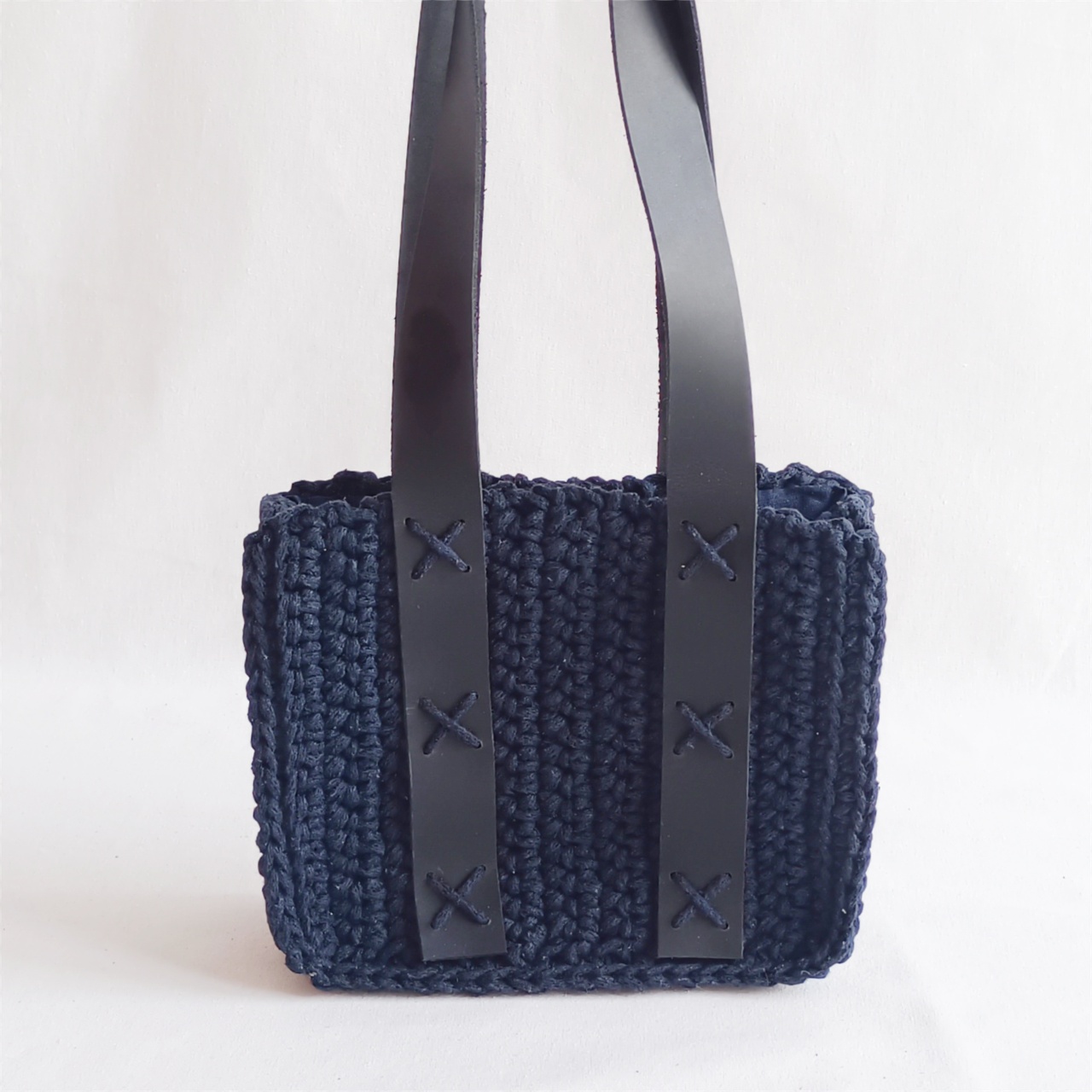 Jedinečná ručně háčkovaná malá kabelka v modré barvě.